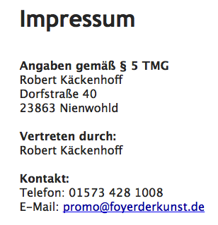 Der Nutzung von im Rahmen der Impressumspflicht veröffentlichten Kontaktdaten durch Dritte zur Übersendung von nicht ausdrücklich angeforderter Werbung und Informationsmaterialien wird hiermit ausdrücklich widersprochen. Die Betreiber der Seiten behalten sich ausdrücklich rechtliche Schritte im Falle der unverlangten Zusendung von Werbeinformationen, etwa durch Spam-Mails, vor.